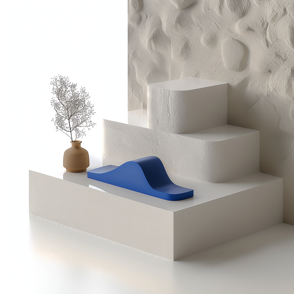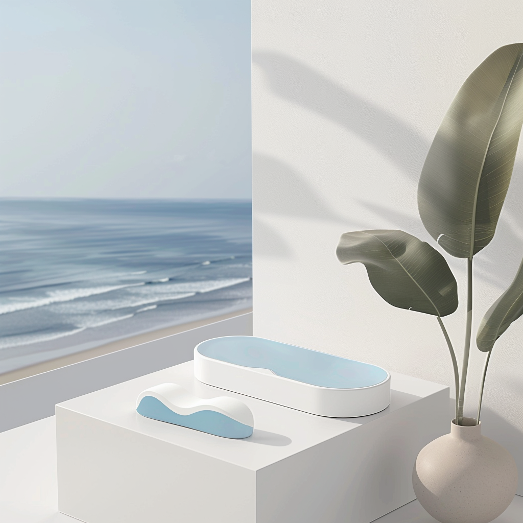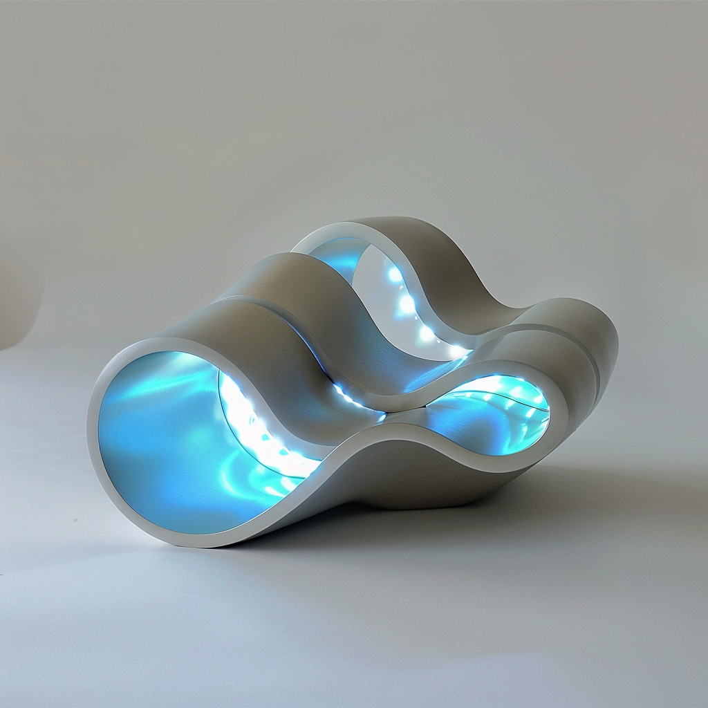 A minimalist wave sculpture rests on the desk, shifting with real surf conditions. The owner overlooks small waves but then notices a large swell, checks a report, and later heads out. Functional and stylish, it grounds the room while keeping the ocean close.